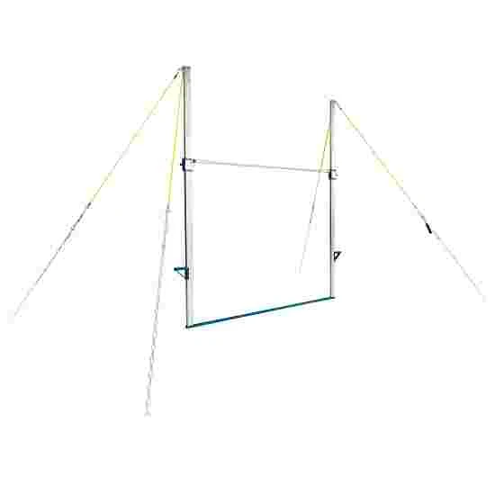 The Bänfer “Vario” horizontal bar is made of robust steel. Its basic structure is made of 2 vertical posts and a horizontal bar. This piece of gymnastics equipment sets itself apart with its easy-to-operate click system for height adjustment. With the practical sliding mechanism, you can adjust the height of the horizontal bar in 5-cm increments from 95 cm (lowest position) to 275 cm (highest position). This makes the horizontal bar suitable for all age groups. 2 footholds make it easier for athletes to get onto the bar. The tensioning cables give the horizontal bar extra stability – even during very swing-intensive exercises.