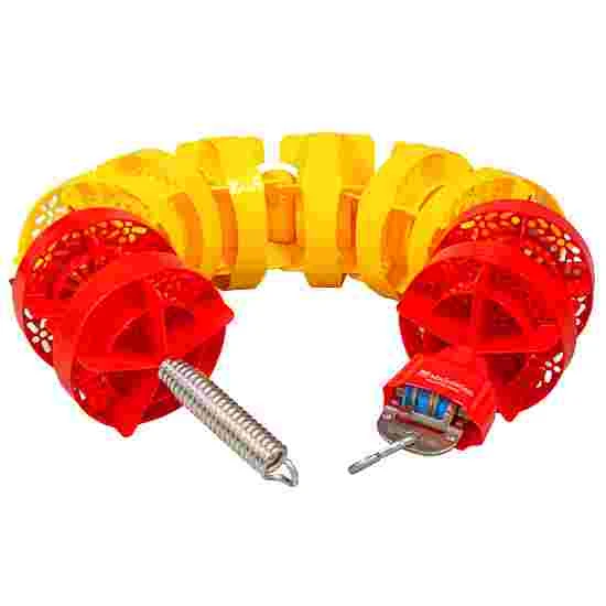 Malmsten “Gold Pro” racing lane lines consist of plastic discs threaded onto a rust-proof steel wire rope. The discs break the waves before they can cause turbulence in the neighbouring lanes. The turnbuckle is covered with a cap and, at the other end, there is a balancing spring to ensure that it sits well on the water. The lines comply with DSV and FINA regulations. They are suitable for use in chlorinated and saltwater pools, and come with red 15-metre markings.
