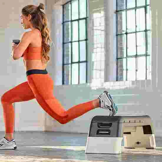 Step and workout bench in one. Two levels of height adjustment (20 and 35Â cm) and four different backrest positions (flat bench, incline bench and seat). Internal storage compartment for small fitness products. Comes fully assembled. Easy to clean, moisture-resistant and hard-wearing. 70% PP, 11.5% TPR, 10% iron, 7% nylon and 1.5% ABS. LxWxH: 121.5×33.7×35Â cm. 12.4Â kg. Max. load: 150Â kg.