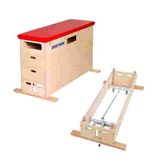 The 4-part vaulting box is made of birch plywood. The top and edges of the top section are padded with a high-quality composite foam and covered with either natural-coloured real leather or red imitation leather. To increase the stability and durability of the vaulting box, all parts are joined with multiple screws. All vaulting box sections have plywood mortise and tenon joints, allowing them to be stacked. These are screwed to each section. The surface of the vaulting boxes is very smooth and varnished. Both base feet are made of hardwood and have non-marking rubber caps. This increases the stability of the vaulting boxes and protects the hall floor at the same time.
